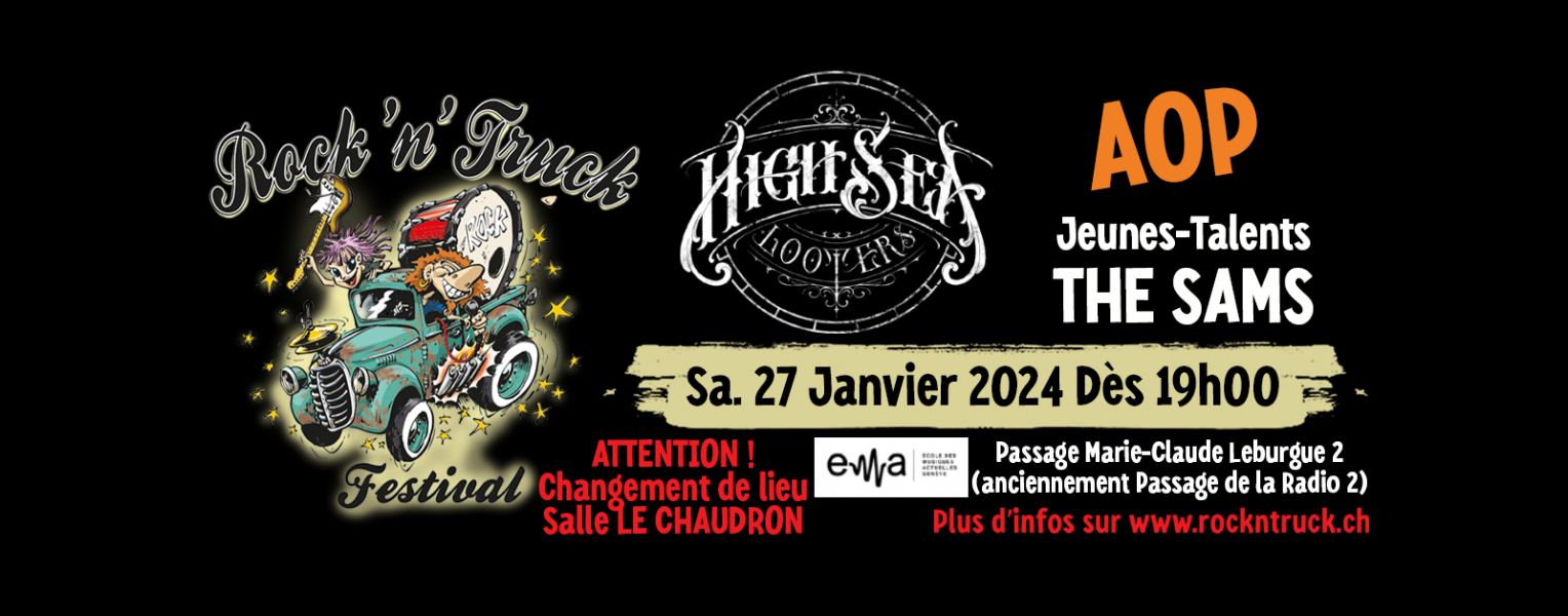 Le 27 janvier 2024, Rock’n’Truck Festival change de lieu , retrouvons-nous à la Salle LE CHAUDRON, Passage Marie-Claude-LEBURGUE 2 (anciennement passage de la Radio 2), 1205 Genève, un grand merci à l’eMa / Ecole des Musiques Actuelles de nous accueillir pour cette édition !!! Pour bien commencer l’année – High Sea Looters , un groupe de Celtic Punk : le punk de pirates qui ont tellement navigué entre les côtes bretonnes et irlandaises qu’ils ne sortent jamais leurs guitares électriques sans accordéon et violon…Le groupe a fait de nombreux concerts tels que la premiere partie des Toy Dolls a l’Usine pour les 30 ans de PTR, l’ouverture du mythique groupe The Rumjacks a L’Undertown, la braderie d’Aigle avec le groupe Booze Brothers, ainsi que des dates dans la suisse romande et alemanique. Des musicien-ne-s de Genève, Lausanne et Chambéry – AOP est un groupe de pop-rock suisse basé à Genève qui vise à créer une atmosphère exaltante à l’aide de rythmes et de mélodies qui touchent aux différentes émotions ressenties. Sur scène AOP est un mélange d’énergie et de fougue, un spectacle authentique qui saura vous séduire par son effervescence et son intensité enivrante – The Sams Trois jeunes talents anarchistes qui décident de combler leurs soirées en réveillant tout le quartier, ça c’est punk ! Des influences de Metal dans du Punk-Rock hyper nerveux et un vrai moment de partage. Voilà ce que The SAMS cherchent à vous offrir